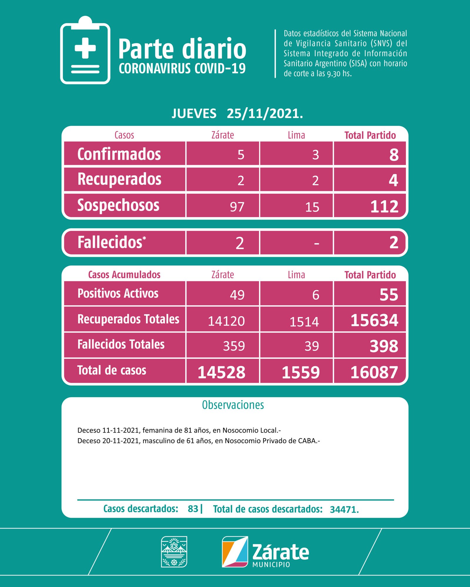 Sin categoría Coronavirus en Zárate: Murieron dos vecinos y confirmaron 8 nuevos casos positivos Redaccion 25 de noviembre de 2021 Compartir 0 Min de Lectura Compartir También te puede interesar Curvas que no mienten: cuando el deseo elige lo grande y lo real Zárate aparece entre los distritos bonaerenses con presencia de arsénico en el agua, según el ITBA Gendarmería secuestró 230 kilos de hoja de coca en Ruta 9 Servicios Públicos continúa con acciones de limpieza preventiva Operativo en Lima: COZ y Prefectura secuestraron mercadería ilegal valuada en $130 millones Redaccion 25 de noviembre de 2021 25 de noviembre de 2021 Compartir esta publicación Facebook Twitter Copiar Link Compartir Publicación Anterior Volvieron a vandalizar la bomba de agua potable de San Cayetano Siguiente publicación Campana: Por el corte del servicio eléctrico que habrá el domingo, se limitará la actividad nocturna Últimas noticias “No voté para sostener el pasado, voté para frenar el abuso” Por Lautaro Fenestraz, Concejal del Partido de Zárate Noticias Locales 10 de diciembre de 2025 Nuevo equipamiento para el área de Neonatología del Hospital Virgen del Carmen Salud 10 de diciembre de 2025 Leandro Matilla asumió la presidencia del Concejo Deliberante de Zárate: “Nos toca liderar una vez más” Noticias Locales 6 de diciembre de 2025 Caso de la pizzería: Marcelo Urra confirmó una segunda denuncia y advirtió que podrían aparecer más víctimas Noticias Locales 6 de diciembre de 2025