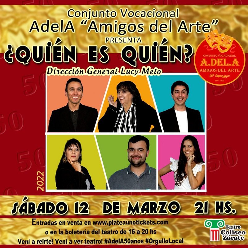 En el marco de los 50 años del grupo, el Conjunto Vocacional limeño «Amigos del Arte» pondrá en escena la comedia de enredos «¿QUIÉN ES QUIÉN?» dirigida por Lucy Melo e interpretada por Mauricio Tabochini, Nanci Centeno, Mauro Fochesato, Sandra Colombo, Laura Castiglioni y Tomás Barletta.