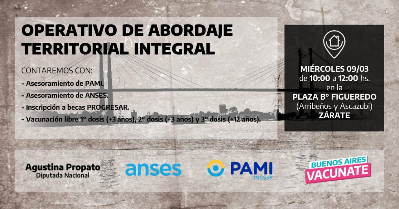 La asociación Civil Union Vecinal Figueredo y Agrupación la 11 de Agosto invitan a participar a la comunidad Zarateña del operativo que se llevará a cabo este miércoles 9 de Marzo de 10 a 12hs.