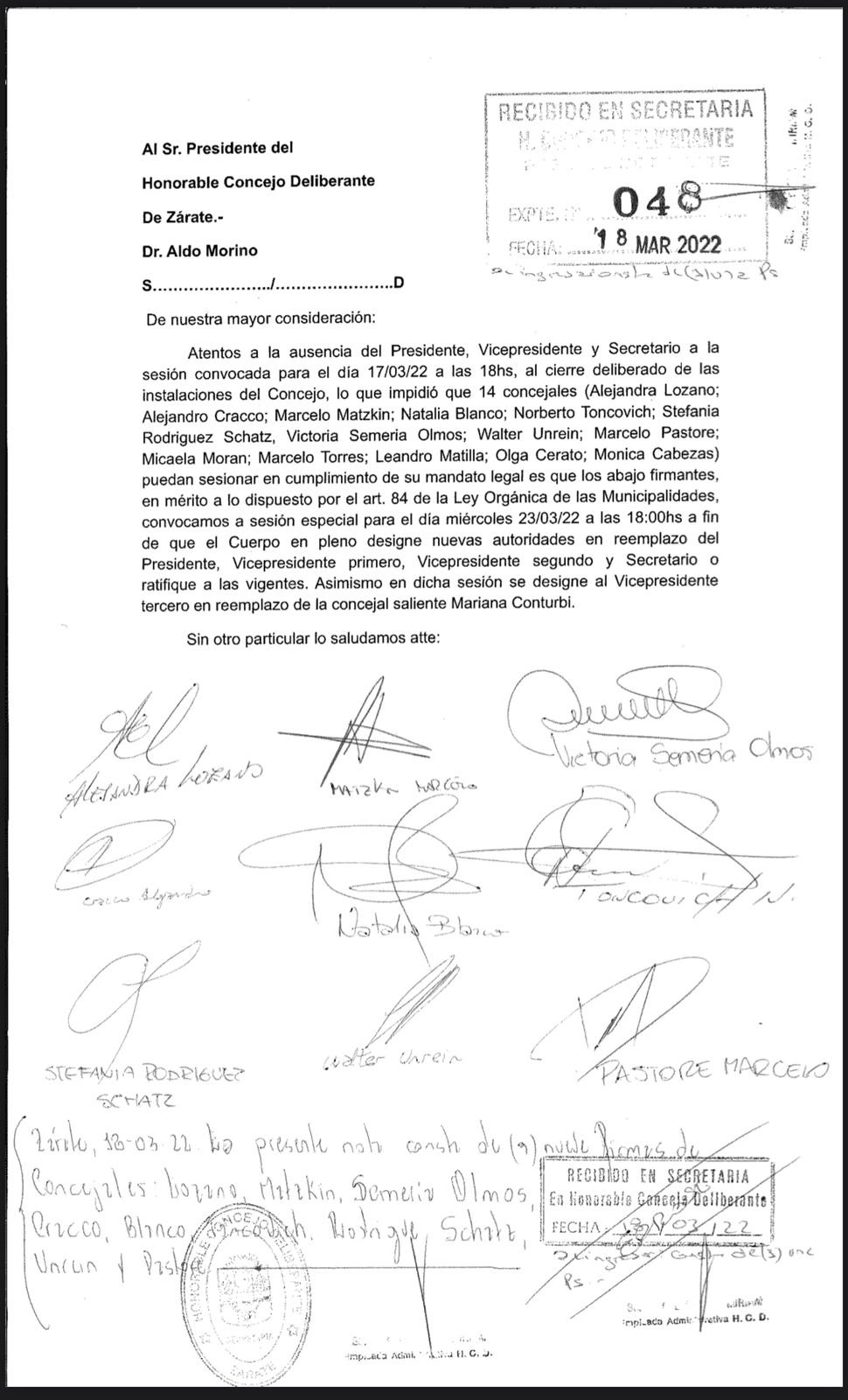 Ayer 14 Concejales de Juntos, PJ, Frente Renovador y Peronismo Renovador, se quedaron sin poder sesionar. Los ediles denuncian que el Presidente del HCD, Aldo Morino, con la complicidad de los Concejales caffaristas, más la Concejal Lorena Bustos, cerraron el Concejo Deliberante y cancelaron arbitrariamente la Sesión.