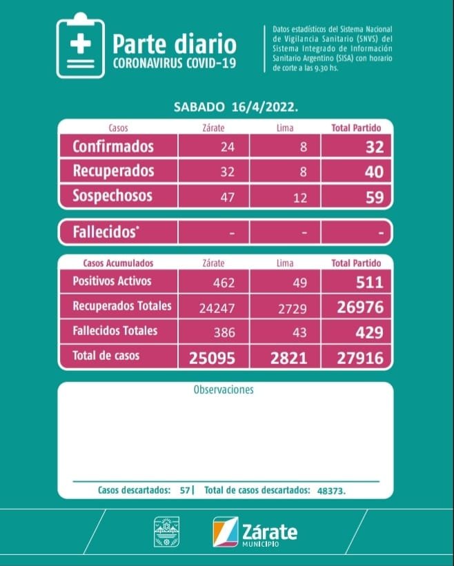 El informe oficial sobre Coronavirus emitido este sábado por la Secretaría de Salud de la Municipalidad de Zárate confirmó que en las últimas 24hs se registraron 32 nuevos casos positivos.