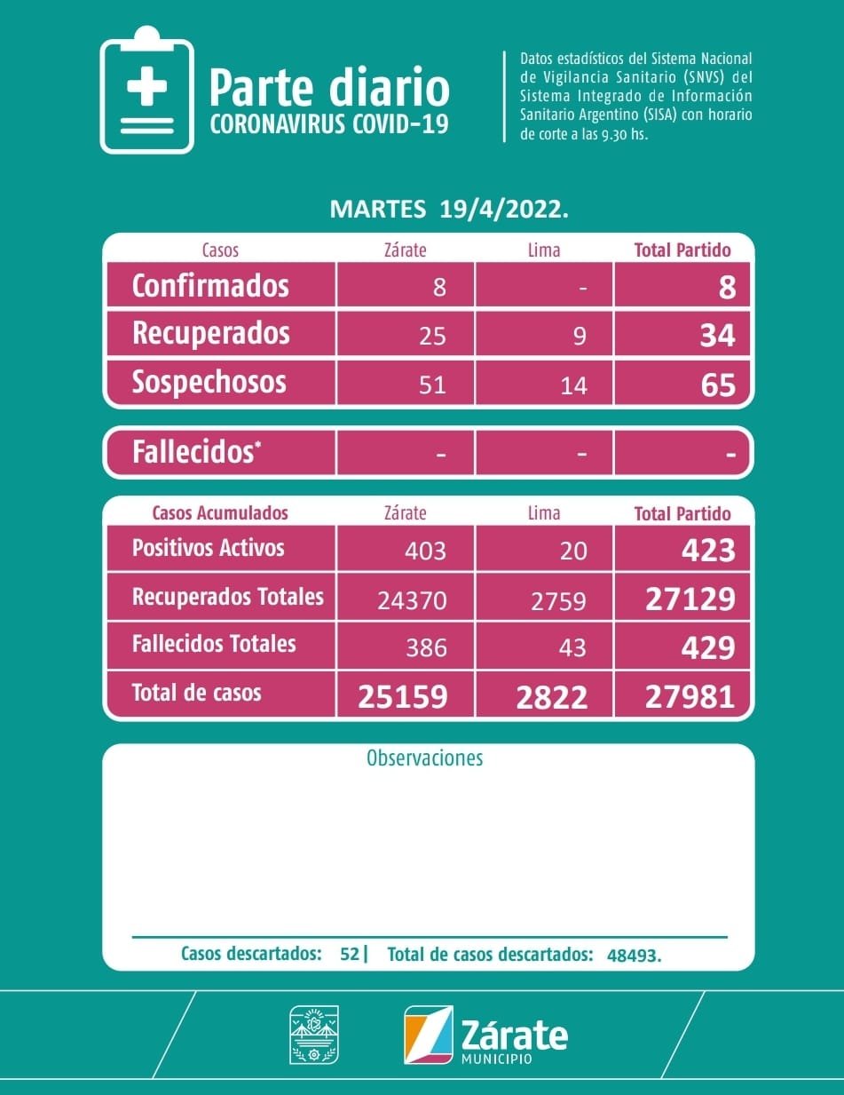 Información General Reportaron 8 nuevos casos positivos de coronavirus en Zárate Redaccion 19 de abril de 2022 Compartir 0 Min de Lectura Compartir También te puede interesar El Gobierno argentino activó alerta “alta” tras el conflicto entre EE.UU., Israel e Irán Punto de Abastecimiento estará este viernes en el Predio Forum Cultural La Línea Mitre suma un paso clave para mejorar la seguridad desde Suárez hasta Zárate Cómo planificar tu viaje al Mundial 2026 sin sorpresas Récord absoluto en Argentina: un afortunado ganó $246 millones en el Bingo Oasis Redaccion 19 de abril de 2022 19 de abril de 2022 Compartir esta publicación Facebook Twitter Copiar Link Compartir Publicación Anterior Una nueva edición del Ciclo de Charlas en Tenaris tuvo a Marcelo Longobardi como primer invitado Siguiente publicación Axel Kicillof en un congreso de la UOM: «la diversidad le da vida al peronismo» Últimas noticias Matzkin propuso relocalizar los boliches a la Costanera y ordenar la noche en Zárate Noticias Locales 3 de marzo de 2026 Apertura de Sesiones: Matzkin proyectó su agenda 2026 y afirmó que irá por el segundo mandato Noticias Locales 2 de marzo de 2026 El feriado por el 172° aniversario de Zárate se traslada al 20 de marzo Noticias Locales 1 de marzo de 2026 Cine Super-8 histórico en Zárate: una invitación a mirarse a sí misma Cultura Noticias Locales 1 de marzo de 2026