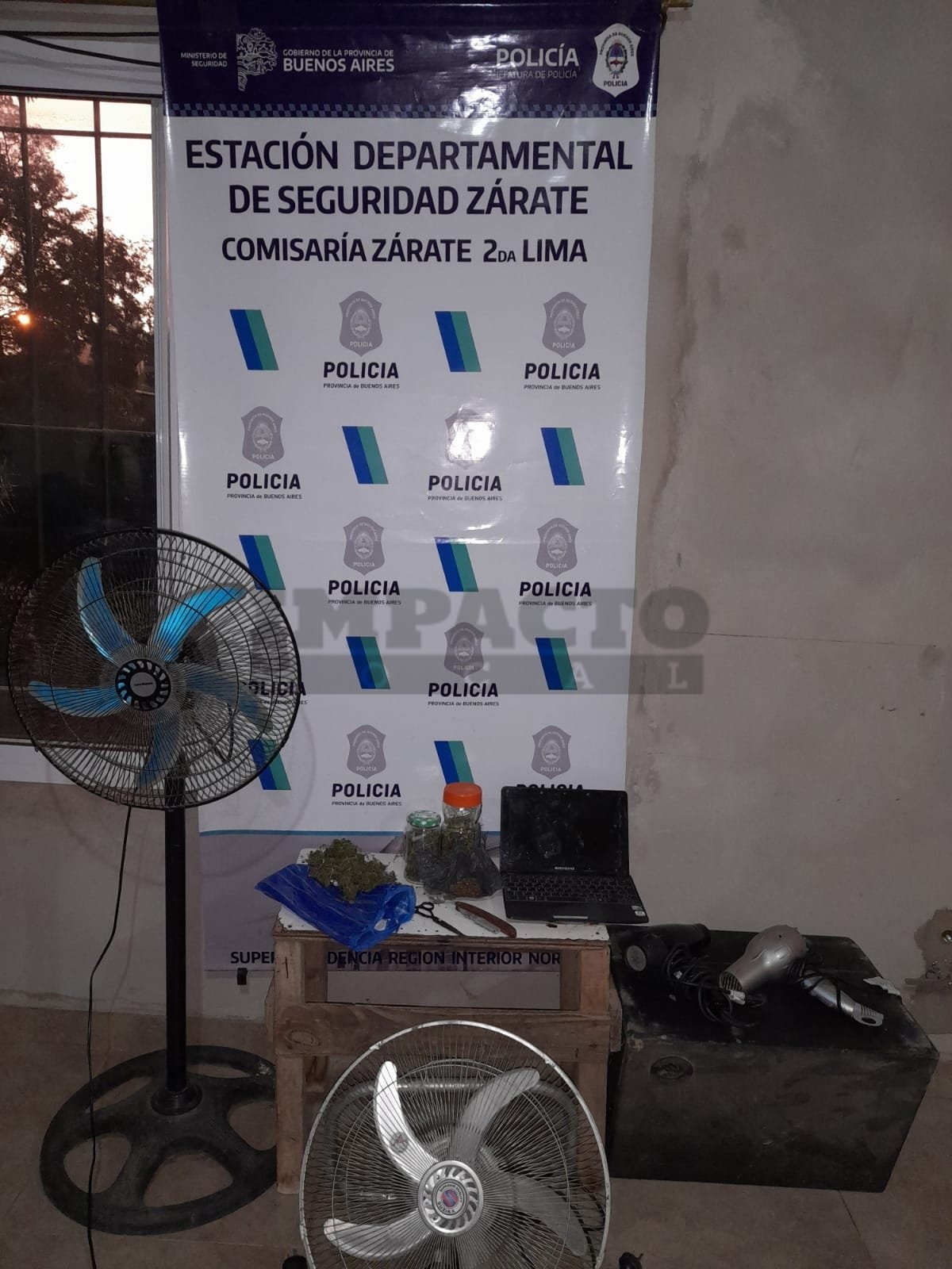 Mientras que en otro allanamiento realizado en Camino Baradero entre 107 y 109 los resultados fueron positivos. En ese sentido se procedió al secuestro de los siguientes elementos: navaja, tijera de peluquería color negra, secador de pelo marca Gama color negro, tres frascos conteniendo flores de Marihuana con un peso total de 96 gramos, una Notebook color negra marca Bangho y un Ventilador de pie.