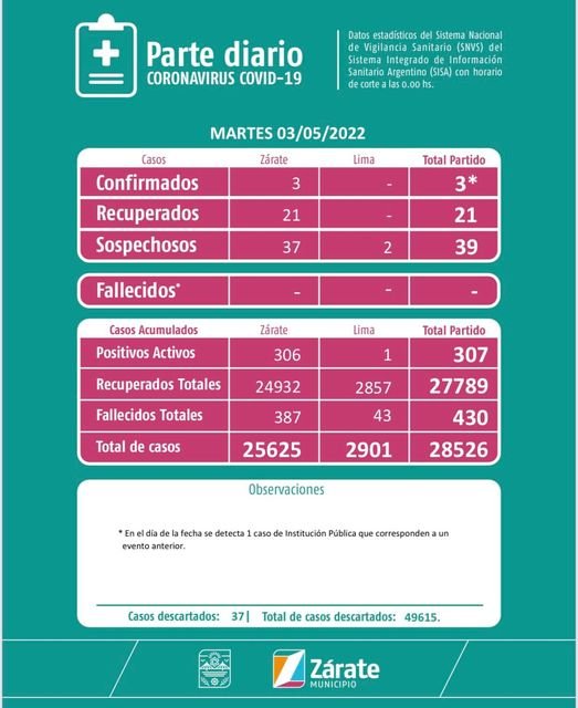 COVID 19Información GeneralSalud Reportaron 3 casos positivos de coronavirus en Zárate Redaccion 3 de mayo de 2022 Compartir 0 Min de Lectura Compartir También te puede interesar El Gobierno argentino activó alerta “alta” tras el conflicto entre EE.UU., Israel e Irán La próxima semana se pone en marcha el mamógrafo en el Centro Médico de Lima Punto de Abastecimiento estará este viernes en el Predio Forum Cultural La Línea Mitre suma un paso clave para mejorar la seguridad desde Suárez hasta Zárate Jornada solidaria: realizarán una colecta de sangre en el Hospital Virgen del Carmen Redaccion 3 de mayo de 2022 3 de mayo de 2022 Compartir esta publicación Facebook Twitter Copiar Link Compartir Publicación Anterior Zárate: Información Necrológica 03/05/2022 Siguiente publicación La Secretaría de Salud presentó las propuestas que trabajará junto a escuelas secundarias de Campana Últimas noticias Matzkin propuso relocalizar los boliches a la Costanera y ordenar la noche en Zárate Noticias Locales 3 de marzo de 2026 Apertura de Sesiones: Matzkin proyectó su agenda 2026 y afirmó que irá por el segundo mandato Noticias Locales 2 de marzo de 2026 El feriado por el 172° aniversario de Zárate se traslada al 20 de marzo Noticias Locales 1 de marzo de 2026 Cine Super-8 histórico en Zárate: una invitación a mirarse a sí misma Cultura Noticias Locales 1 de marzo de 2026