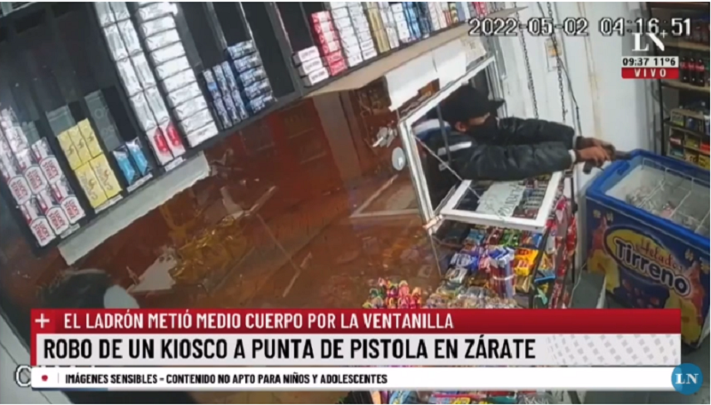 A un día que los responsables de la seguridad en Zárate no se presentaron al Concejo Deliberante, el medio nacional La Nación + reprodujo las imágenes del asalto al kiosko ubicado en Sarmiento y Bolivar.