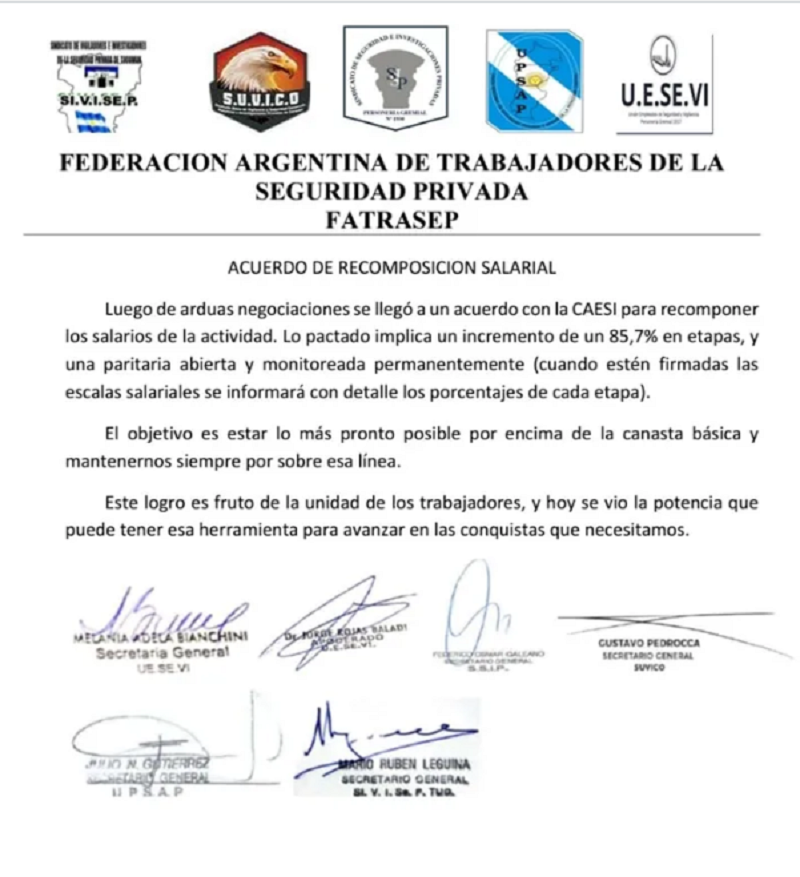 FATRASEP, que integran los gremios SSIP, SUVICO, SIVISEP, UPSAP y UESEVI, anunció un acuerdo salarial que contempla un 85,7% de aumento para vigiladores.