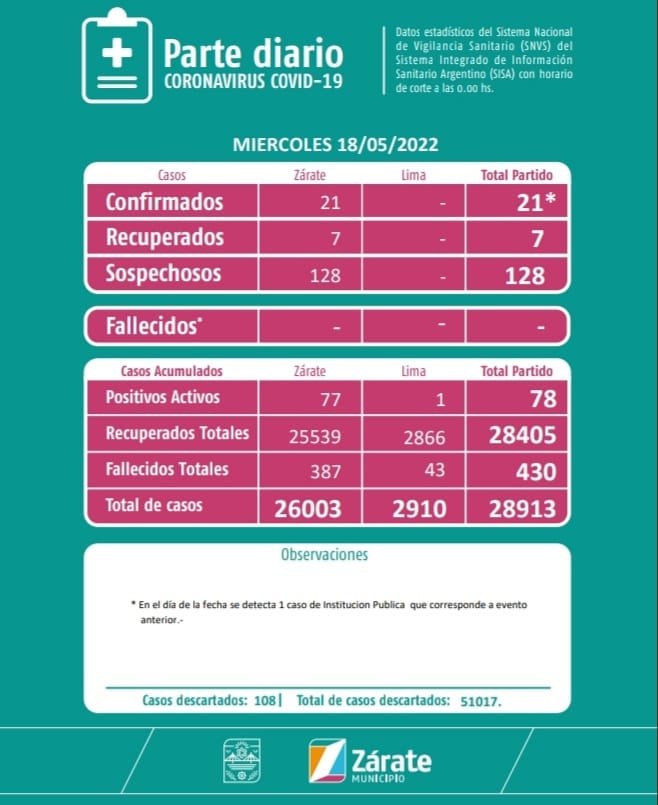 COVID 19Información GeneralSalud Reportaron 21 casos positivos de coronavirus en Zárate Redaccion 18 de mayo de 2022 Compartir 0 Min de Lectura Compartir También te puede interesar El Municipio realizó una jornada de vacunación antigripal para grupos prioritarios Exitosa jornada ambiental del Municipio junto a la Colonia del Campana Boat Club Campana disfrutó de una noche especial con la gastronomía como protagonista Convocan a emprendedores + 60 para participar de una exposición por el Día de la Mujer Punto Verde Móvil: los vecinos pueden llevar materiales electrónicos y eléctricos para reciclar Redaccion 18 de mayo de 2022 18 de mayo de 2022 Compartir esta publicación Facebook Twitter Copiar Link Compartir Publicación Anterior Farmacias de Turno 18/05/2022 Siguiente publicación Censo 2022: ¿A qué hora reabren los comercios? Últimas noticias Se lanzó en Zárate el programa Red Orgullo del Ministerio de Mujeres y Diversidad de la Provincia de Buenos Aires Noticias Locales 18 de marzo de 2026 Parada de Atucha impulsa el empleo local con más de 300 trabajadores activos Gremiales Noticias Locales 18 de marzo de 2026 Spillman: “Hubo más gente en el Festival de Tango que votando en la interna del peronismo” Política 17 de marzo de 2026 Obras en Lima: intervienen calzadas para mejorar el tránsito y la seguridad Noticias Locales 16 de marzo de 2026