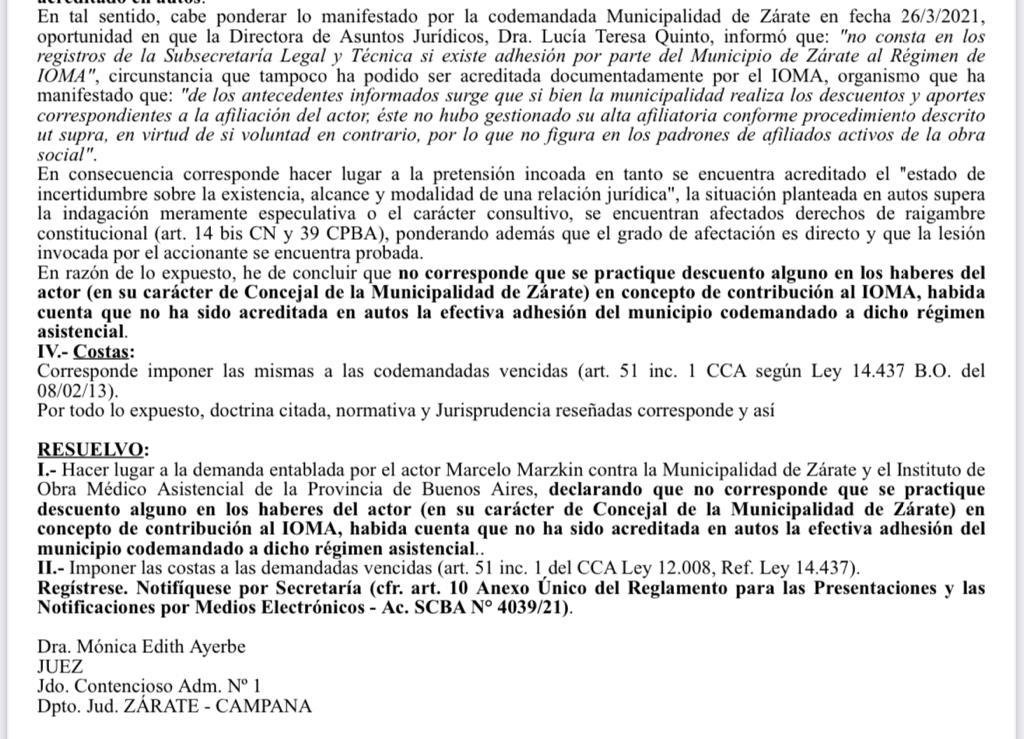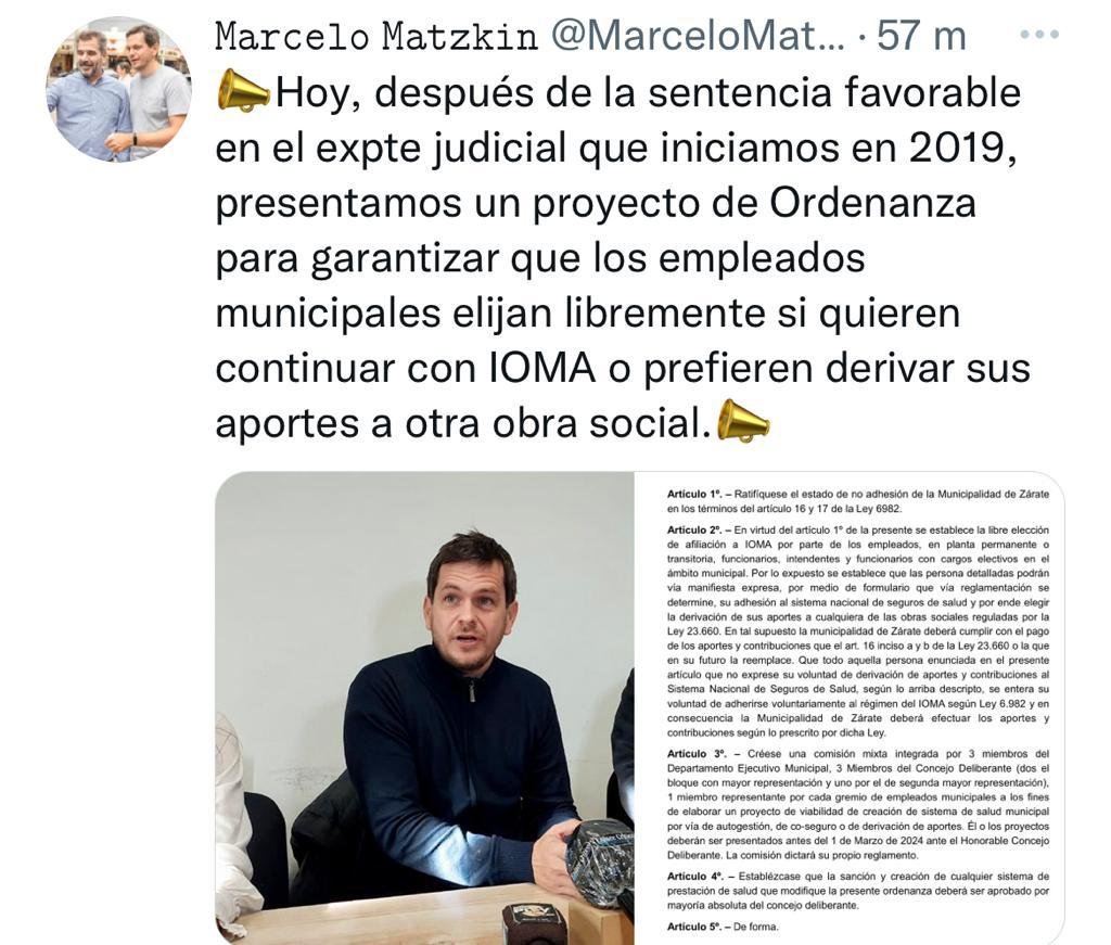 “Tuve que iniciar una acción judicial a nivel personal hace casi tres años para que la justicia admita que el municipio de Zárate nunca había adherido al sistema asistencial de IOMA, parece que en este municipio nadie se pone a leer ni estudiar, porque significa que hace años se le está privando a los trabajadores de tener un sistema de salud muy superior del que tienen” dijo el concejal a lo que agregó “es parte de la desidia de este gobierno para con los trabajadores, no los capacita, no los jerarquiza y tampoco les ha brindado alternativas para mejorar el sistema de salud de ellos y de sus familias” remarcó Matzkin.