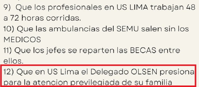 “¿Quisiera saber dónde están los beneficios que yo tengo? Ayer le mandé una carta documento para que esta persona se pueda retractar o demostrar los beneficios que yo tengo. Siempre hemos tenido un buen diálogo. Y esto me pareció muy extraño. Yo soy un funcionario público, pero mi familia no está dentro de la función” continuó Olsen, quien manifestó su apoyo para que la Unidad Sanitaria de Lima pueda tener médicos.
