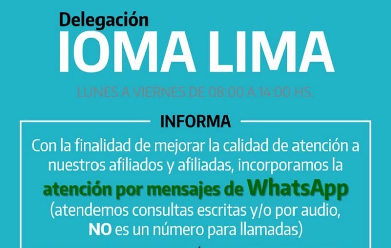 La Delegación de IOMA Lima informó que con la finalidad de mejorar la calidad de atención a los afiliados y afiliadas, incorporaron la conexión a través de mensajes de WhatsApp al 3487-395194.