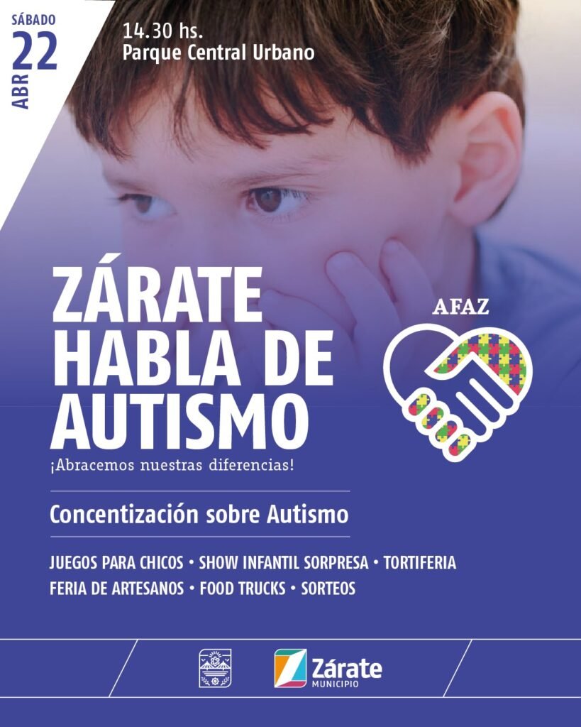 El Municipio y la Asociación Civil Familias del Autismo Zarate (AFAZ) realizarán un evento de concientización del Trastorno del Espectro Autista (TEA). Será este sábado 22 de abril a partir de las 14:30 hs en el Parque Urbano.