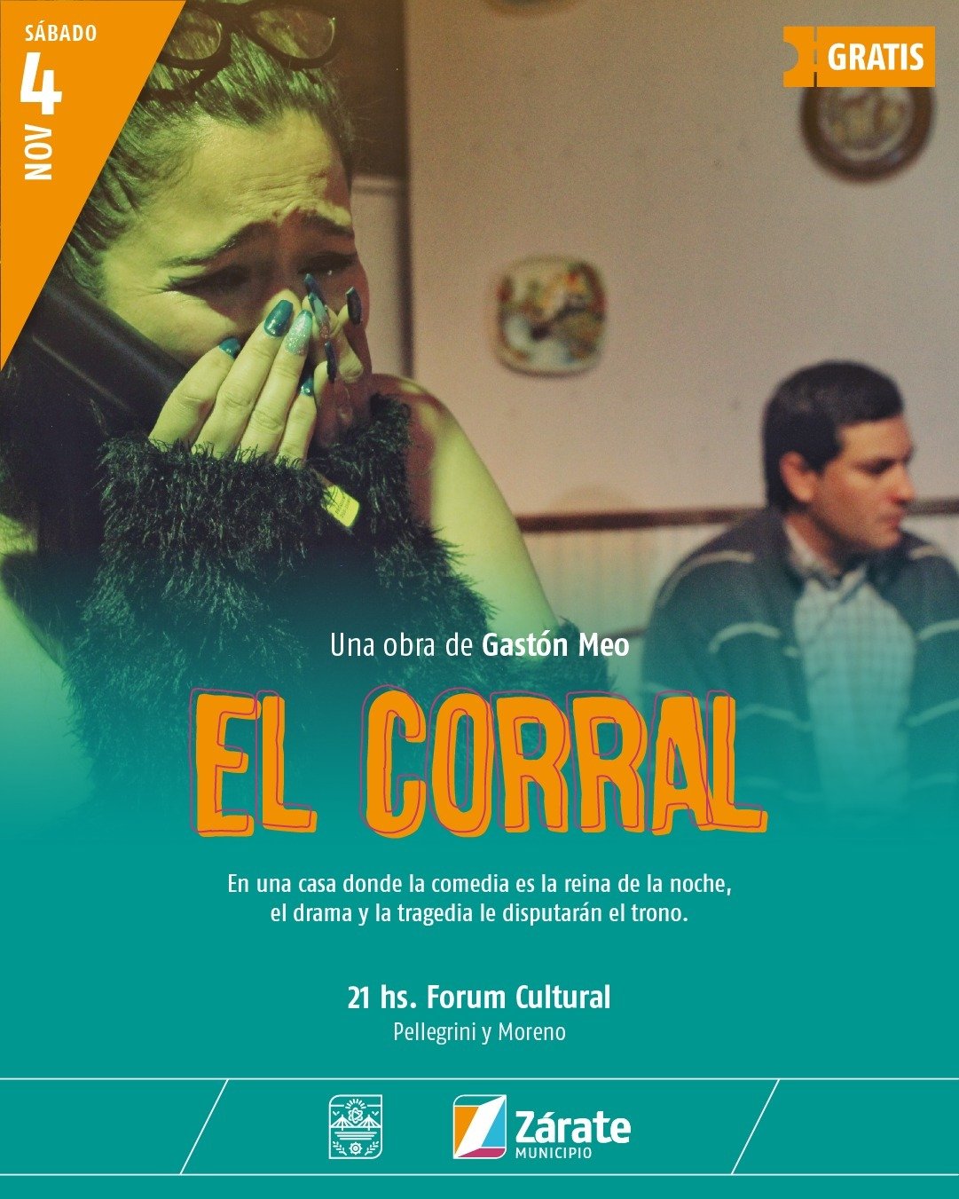 El Municipio de Zárate, a través de la Dirección General de Cultura presentará este sábado 4 de noviembre a las 21 hs en el Forum Cultural (Pellegrini y Moreno), una obra dirigida por Gastón Meo.