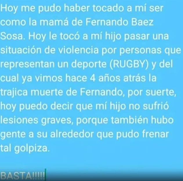 “Hoy me pudo haber tocado a mí ser la mamá de Fernando Báez Sosa. Hoy le tocó a mi hijo pasar una situación de violencia por personas que representan un deporte (rugby) y del cual ya vimos 4 años atrás la trágica muerte de Fernando”, relató la mujer.
