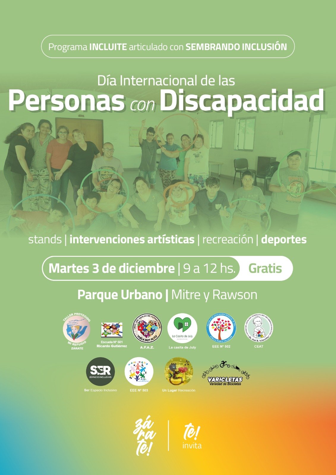 En la misma habrá intervenciones artísticas, stands, recreación y deportes. Participan del encuentro: Taller protegido Mi Refugio, Escuela N.º 501, A.F.A.Z, (Asociación Civil Familias del Autismo Zárate), Asociación civil La Casita de July, Escuela de Educación Especial N.º 502, CEAT, (Centro de Atención temprana del desarrollo Infantil), Ser Espacio Inclusivo, Escuela de Educación Especial N.º 503, Un lugar Recreación, y Varicletas, (Variedad de Bicicletas).