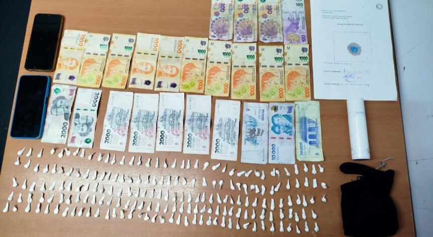 A pocos metros del lugar, el personal logró interceptar e identificar a los dos sujetos, quienes tenían en su poder dos teléfonos celulares y $64.400 en efectivo. Con la autorización de la propietaria del inmueble, se constató sobre el techo una bolsa que contenía 190 envoltorios de nylon con un total de 36 gramos de cocaína.