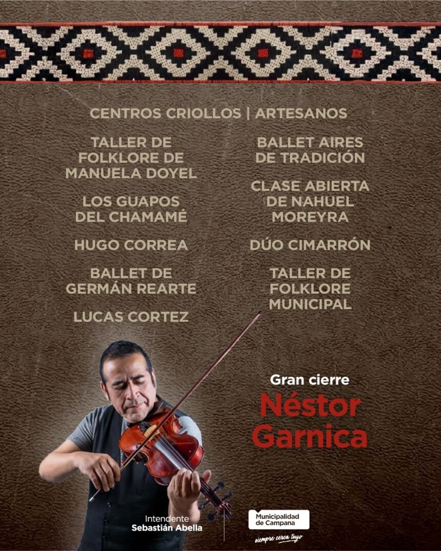 La música sonará de la mano de los artistas campanenses Hugo Correa, Lucas Cortez, Los guapos del chamamé y Dúo Cimarrón, mientras que el gran cierre estará a cargo de Néstor Garnica, uno de los artistas más reconocidos del folclore nacional, cuya presentación está prevista para las 19:30.
