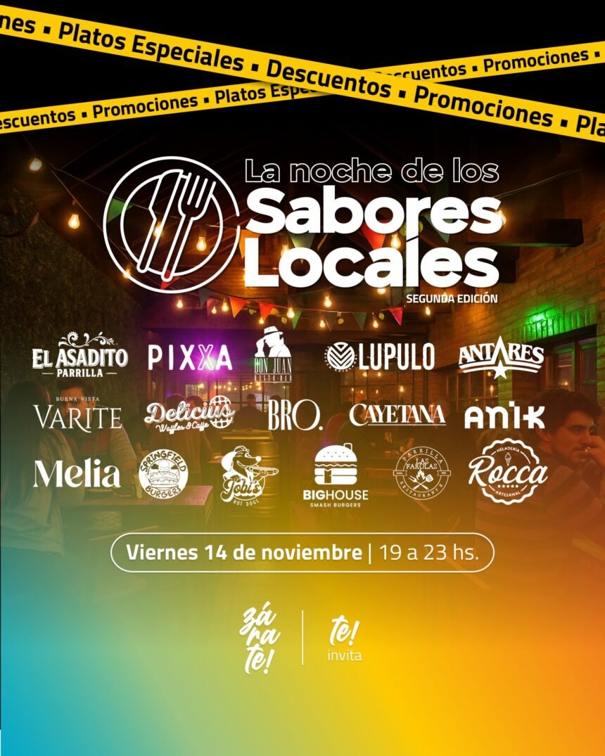 El viernes 14 de noviembre de 19 a 23 hs. se realizará la segunda edición de “La Noche de los Sabores Locales”, una propuesta para disfrutar de la mejor gastronomía, zarateña. Durante esa noche, los locales ofrecerán platos especiales, descuentos y promociones. En esta edición participan: “El Asadito Parrilla”, “Pixxa”, “Don Juan”, “Lupulo”, “Antares”, “Buena Vista Varite”, “Delicius waffles & Coffe”, “Bro”, “Cayetana”, “Anik”, “Melia”, “Springfiel Burgers”, “Tobi´s Hot Dog”, “BigHouse Smash Burgers”, “Parrilla Las Farolas Restaurante”, “Heladería Artesanal Rocca”.