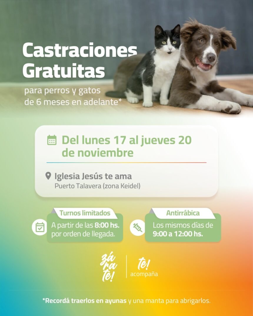Los próximos operativos de castración se realizarán del lunes 17/11 al viernes 20/11 en Iglesia Jesús te ama (Puerto Talavera – zona Keidel) Los turnos son limitados y comienzan a partir de las 8:00 hs. por orden de llegada.