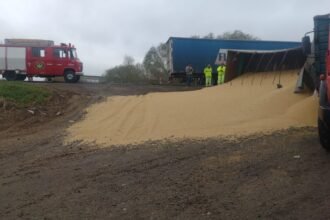 Un camión con acoplado volcó la carga de cereal en cercanías del Puente Zárate-Brazo Largo